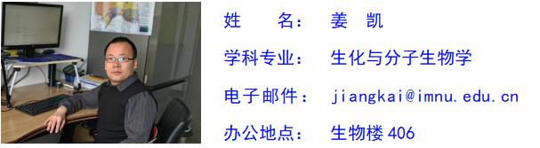 姜凯,男,汉族,中共党员,理学博士,副教授,学术型硕士研究生指导教师,现任澳门十大信誉网赌大全生物科学系主任。研究方向为微生物资源开发与利用、CPR及DPANN等未难培养微生物的可培养研究。主持国家自然科学基金项目1项,内蒙古自然科学基金项目1项,内蒙古自治区直属高校基本科研业务费项目1项,内蒙师范大学校级项目2项。在《Microbial Biotechnology》、《Archives of Microbiology》、《Scientific Reports》和《微生物学通报》等刊物发表论文10余篇,参编专著2部。承担“微生物学”、“微生物学实验”、“生物安全”、“无机化学实验”、“科学精神”等本科及研究生课程。