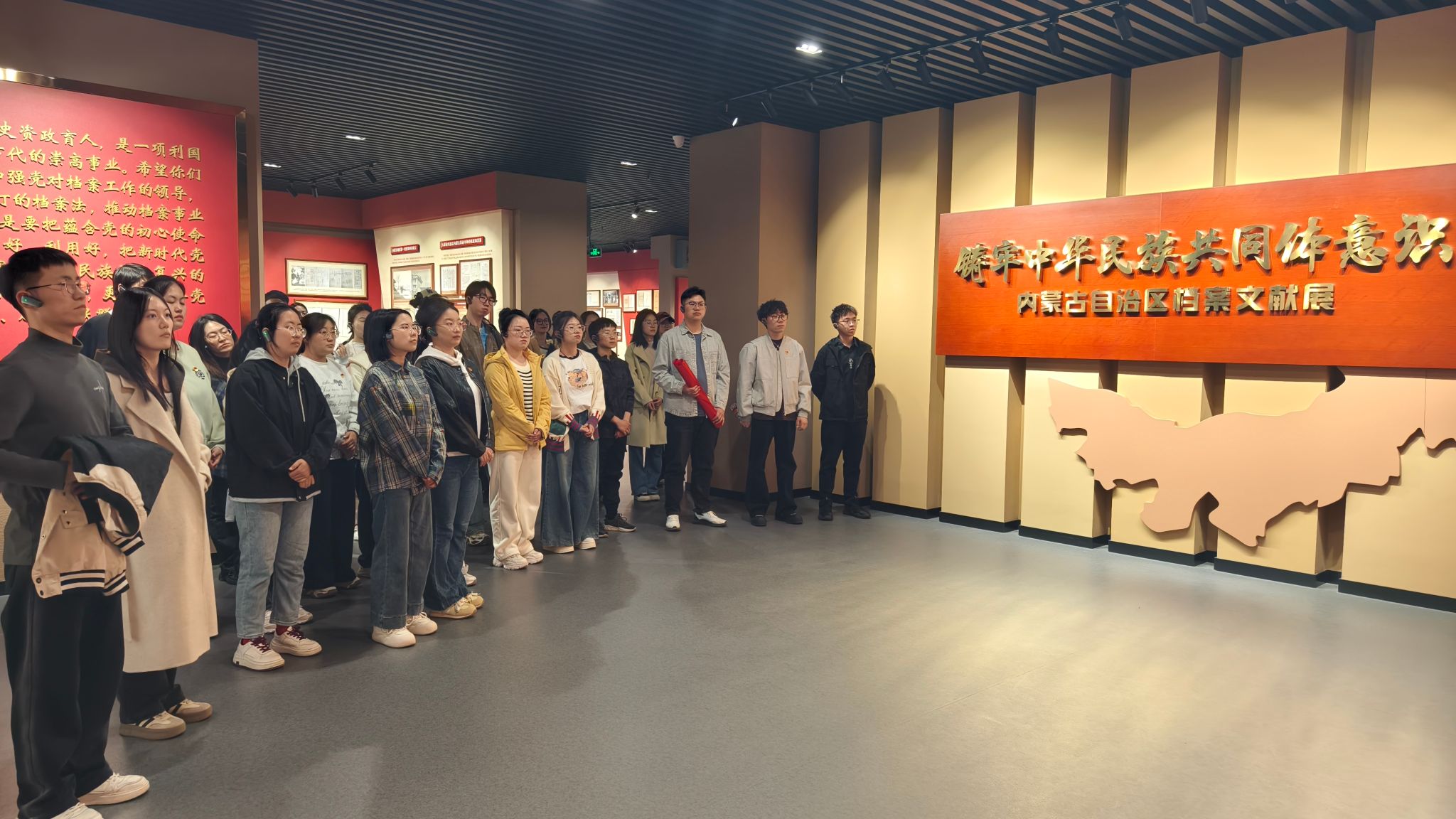 在铸牢中华民族共同体意识档案文献展中,党员们深入了解了内蒙古自治区各族人民在党的领导下团结奋斗、共同发展的光辉历程。展览充分体现了中华民族多元一体格局的发展脉络与团结精神,进一步增强了党员的政治认同、文化认同和历史责任感。活动最后,全体党员在党旗下庄严肃立,重温入党誓词。铿锵有力的誓言再次唤醒初心、坚定信仰,增强了遵规守纪的自觉性和干事创业的使命感。