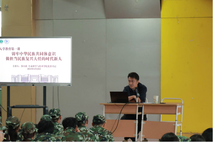 9月20日上午,学院党委书记苏小波以“铸牢中华民族共同体意识,做担当民族复兴大任的时代新人”为题,围绕“信仰信念”和“大学生涯”两个关键词讲授入学教育第一课。讲座伊始,以“爱国三问”为开端,唤起青年学子的家国情怀,传承爱国精神,通过一个个生动详实的例子帮助新生树立正确的国家观、历史观、民族观、文化观、宗教观,增强各民族学生的认同感与团结意识,了解各民族的历史文化和传统风俗,切实铸牢中华民族共同体意识。同时,明确指出高校是意识形态前沿阵地,要始终坚持教育与宗教相分离,青年学生要崇尚科学,自觉抵御和防范校园非法宗教渗透。讲座中,还围绕校史校情教育、新生适应性教育和生命教育,帮助新生树立奋斗目标、养成良好习惯,尽快适应大学生活。