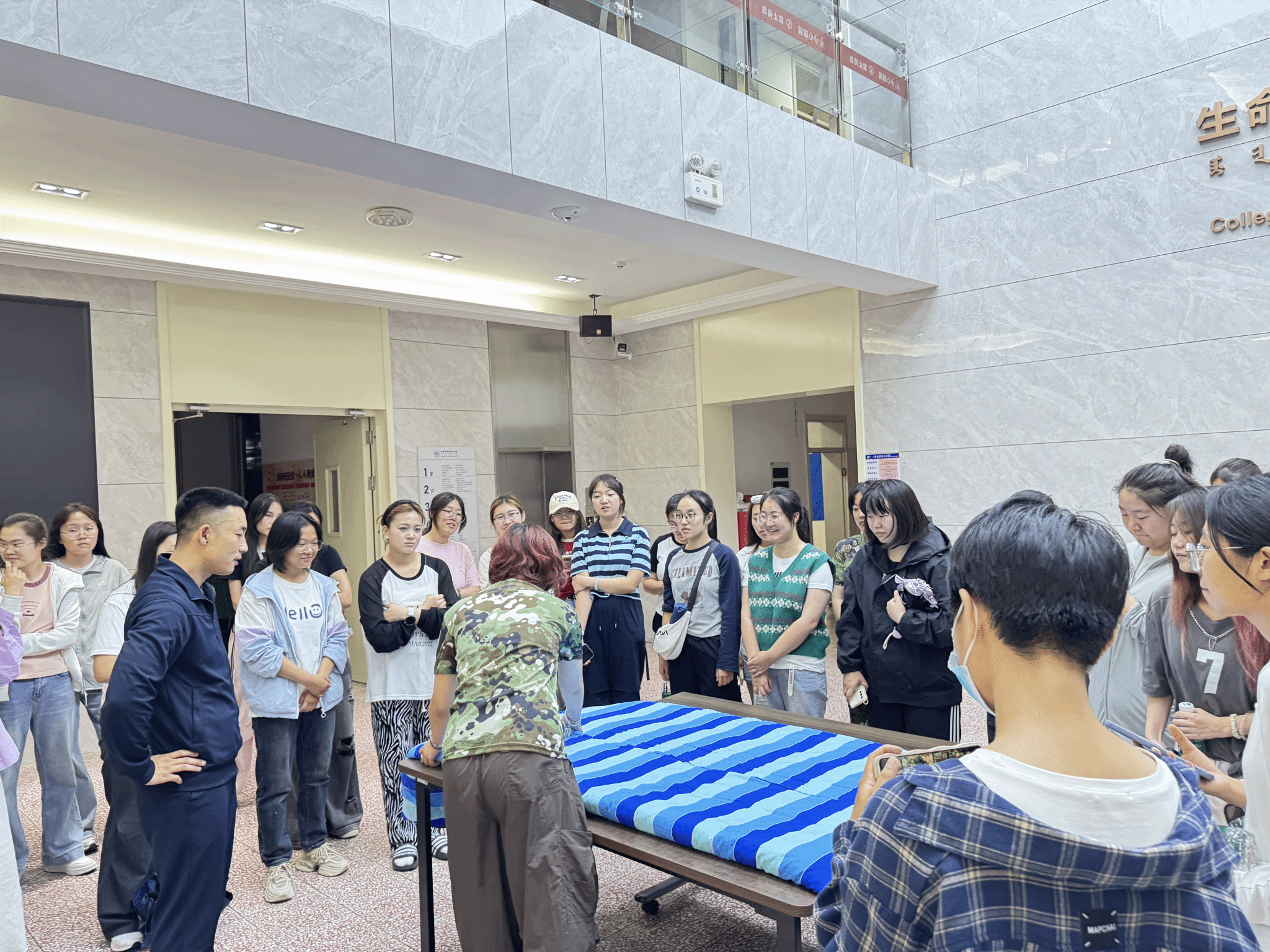 邀请到了退伍大学生信誉网赌大全2025级学硕班李德龙同学给新生们展示“豆腐块”式军被的叠法。学长手把手地示范动作要领,从铺平、折角到压实、定型,每一个步骤都需要耐心与细致。军训不仅锻炼身体,更是对意志品质和生活习惯的磨砺。