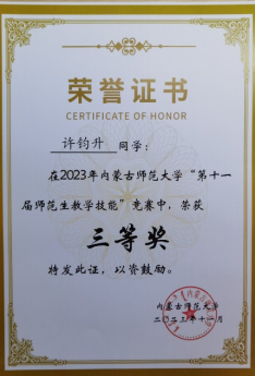 澳门信誉最好十大平台“第十一届师范生教学技能”竞赛于2023年11月4—5日在盛乐校区隆重举行,在本次比赛中,信誉网赌大全经过层层选拔,选派2020级生物科学汉2班的裴琦钰、许钧升和2021级生物科学蒙班的苏日娜共三名同学参加了本次技能大赛,指导教师为李景环、牛艳芳、高峰和乌云高娃。经过赛前师生的精心准备和赛场上的激烈角逐,最终裴琦钰同学获得二等奖,许钧升和苏日娜同学获得三等奖。 奖获者荣誉证书 二等奖获得者合影 三等奖获得者合影