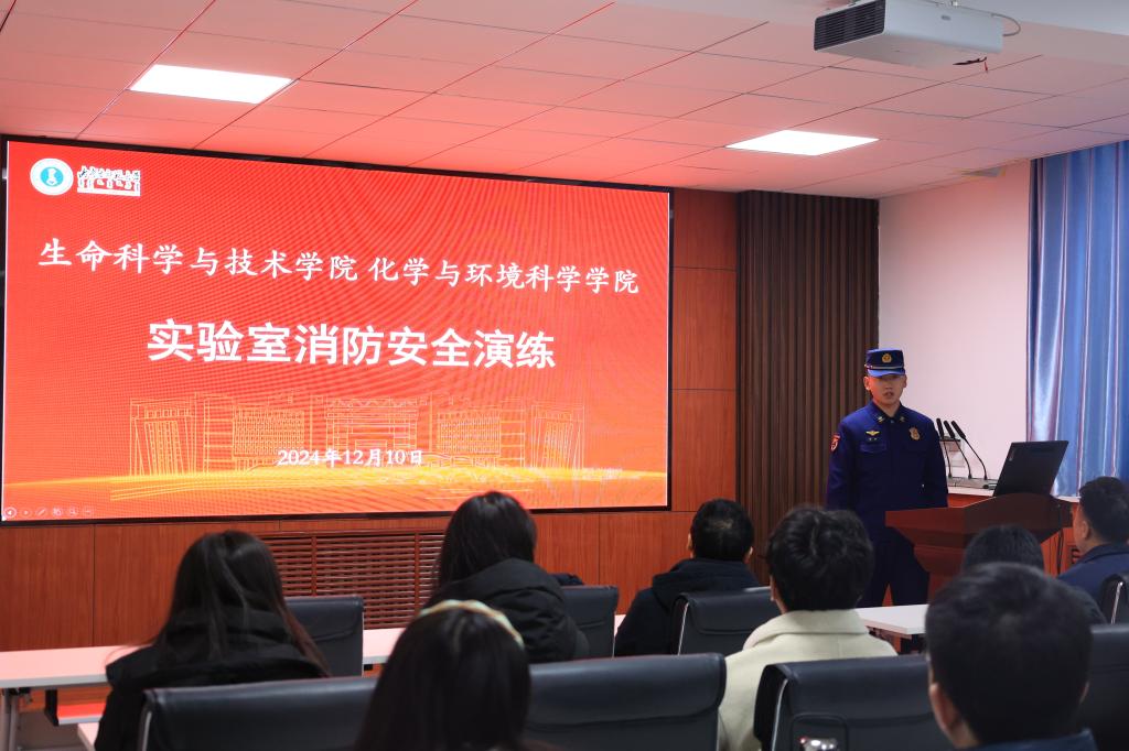 活动伊始,赛罕区山丹街消防救援站宣讲员为全体师生作实验室安全教育培训,详细分析实验室安全风险点,列举了高校实验室安全事故典型案例,同时围绕实验室常见火灾隐患、易燃化学品储存要求、火灾自救与互救等内容进行了详细讲授。