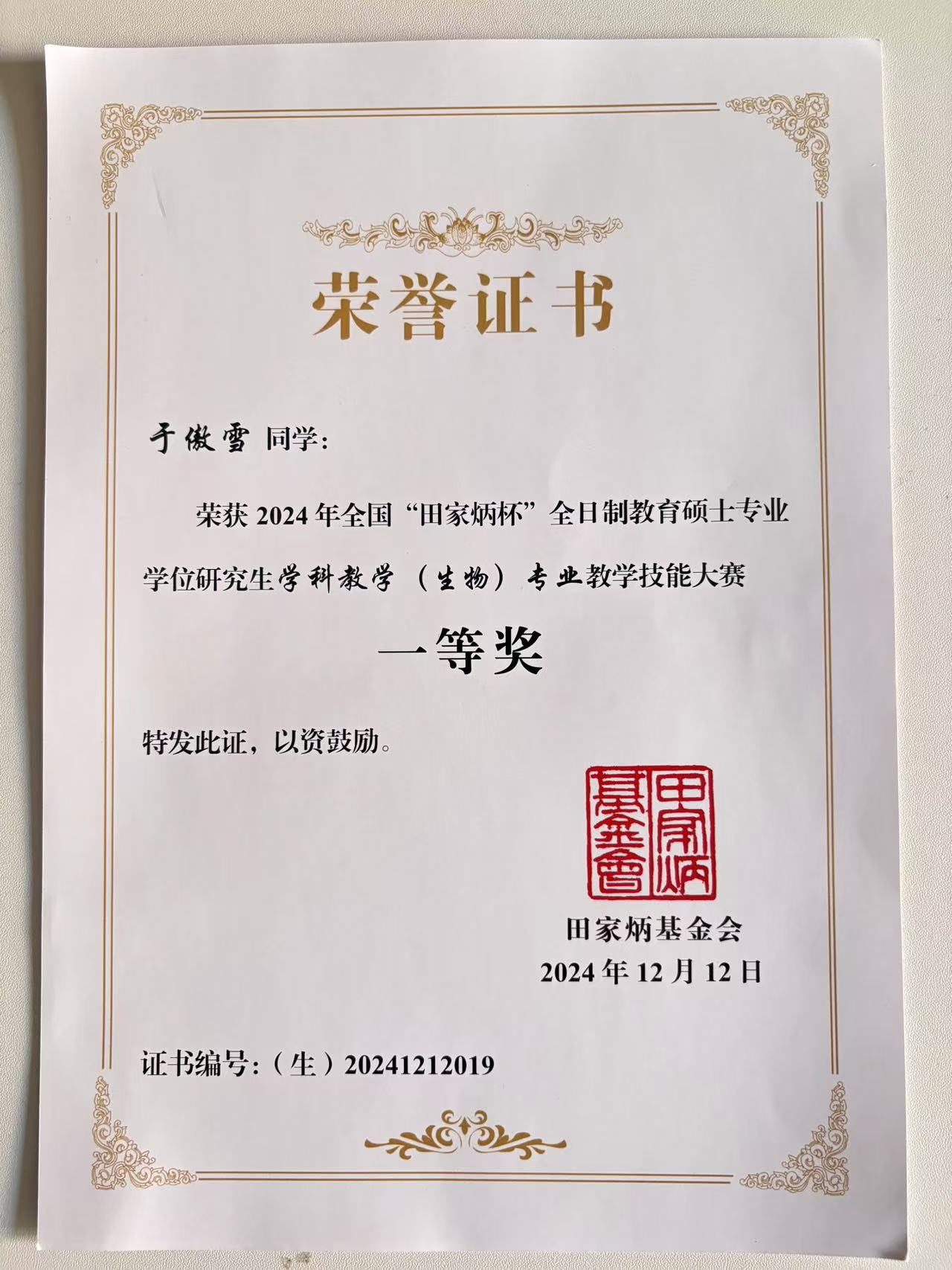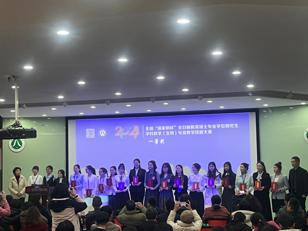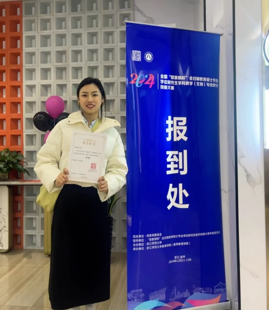 12月11日至13日,2024年全国“田家炳杯”全日制教育硕士专业学位研究生学科教学(生物)专业教学技能大赛决赛在浙江师范大学落下帷幕。经过激烈的角逐,学院23级专硕班于傲雪同学在指导老师红雨教授,高峰副教授的悉心指导下,凭借扎实的教学功底和良好的现场表现,荣获生物组一等奖,红雨老师荣获优秀指导教师奖,这是信誉网赌大全学子再次在该项赛事中获得全国一等奖。