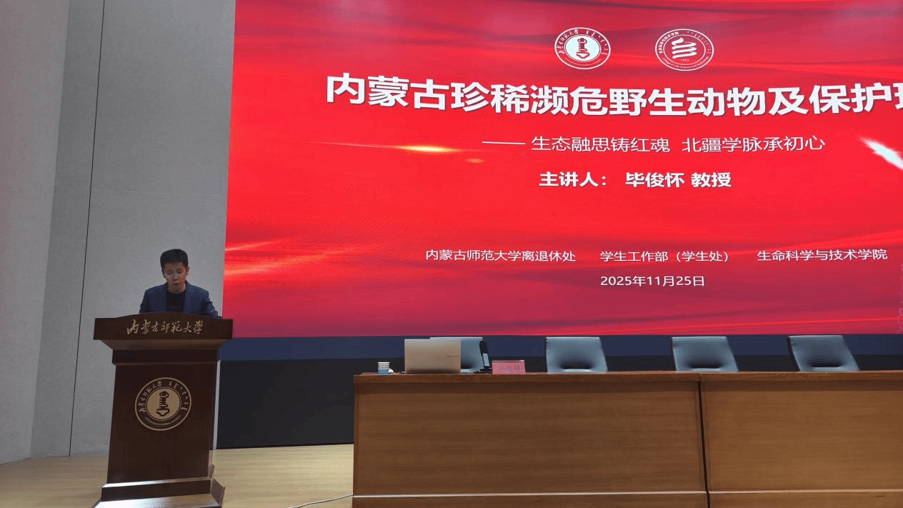为扎实推进党建与育人工作深度融合,营造良好的学风氛围,2025年11月25日,澳门信誉最好十大平台学生工作部(学生工作处)、离退休教职工工作处联合主办,澳门十大信誉网赌大全承办的离退休教授宣讲活动在赛罕校区信息楼学术报告厅举行。本次活动以"生态融思铸红魂,北疆学脉承初心"为主题,邀请毕俊怀教授做了题为《内蒙古珍稀濒危有蹄类动物资源现状与保护》的专题讲座。