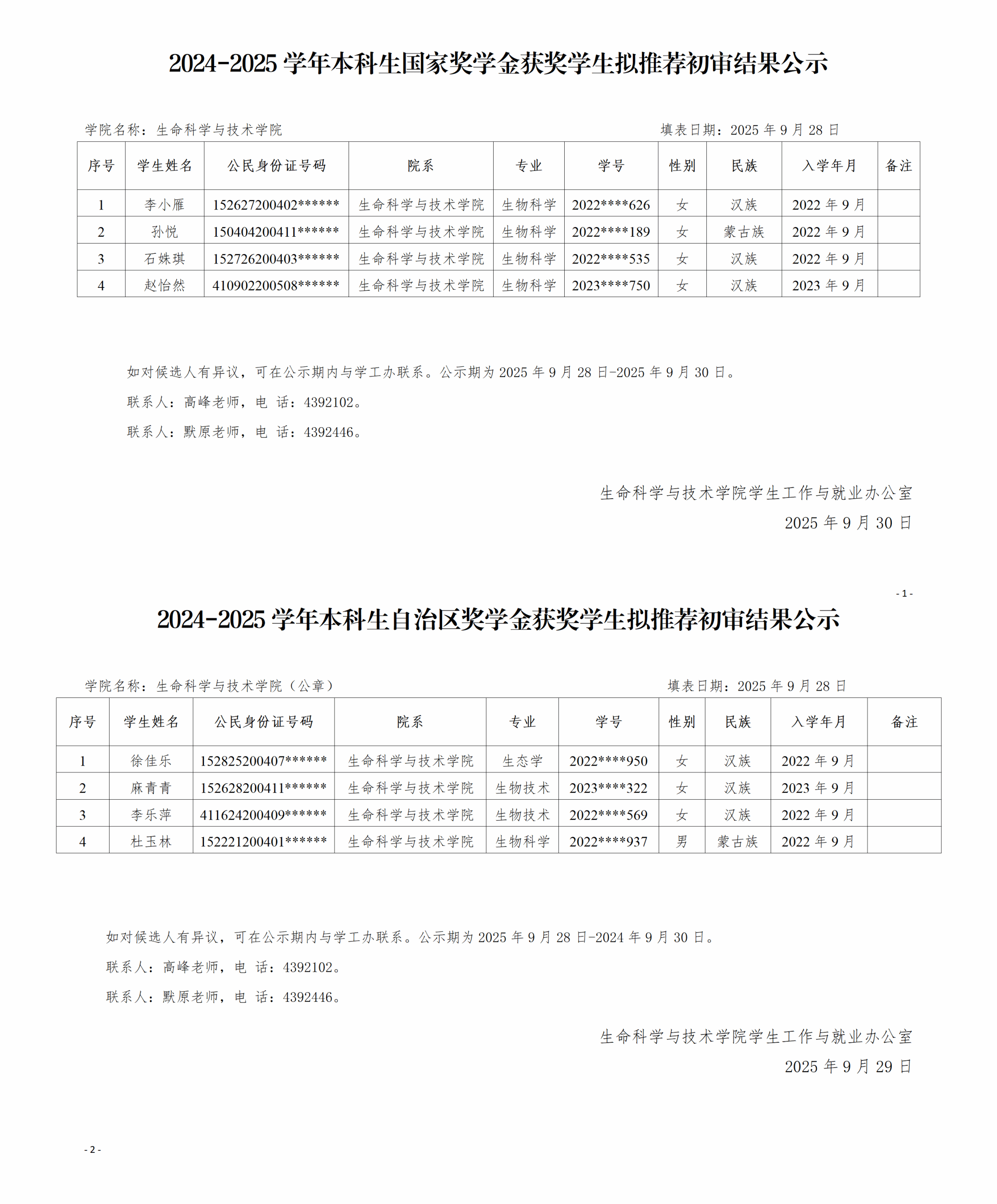 2024-2025学年本科生国家奖学金获奖学生拟推荐初审结果公示